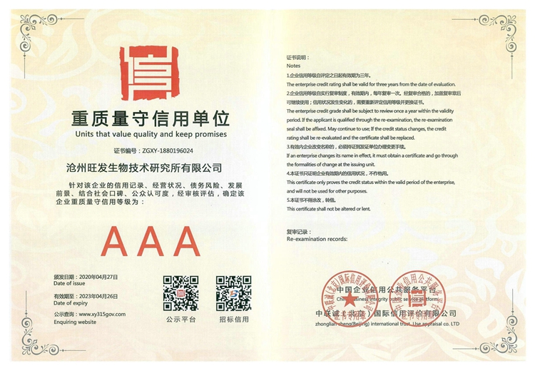 滄州旺發生物技術研究所有限公司創立于1993年,是集研發、生產、銷售于一體的微生態制劑生產“高新技術企業”、“國家知識產權優勢企業”、“河北省農業產業化重點龍頭企業”、“河北省創新型中小企業”、“河北省專精特新中小企業”,目前,公司注冊資金1360萬元,生產占地80畝,擁有液、固態結合全自動發酵生產線及標準化全自動液態發酵、噴霧干燥生產線。